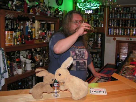 Nick tending the bar... Unfortunately all the different kinds of beer & wine glasses