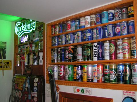 A collection of beer cans on the wall.