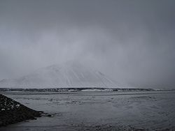 The weather's horrible as we leave Reykjavík, and the mountain landscape during the first hour of our drive is amazing: almost black & white, with only a slight hint of brown. This is not a very good example, but you'll get the idea... |
