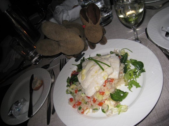 | After watching some international short films, it's time for dinner back at the hotel. A light carrot & orange soup, followed by pan-fried halibut on a bed of cous cous. The fish is *so* tender and lovely. |