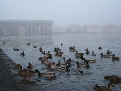 | Friday 20 February: It's been warm, grey & wet for a while - the ice on the pond has melted. And this afternoon, it was totally misty for a while. |