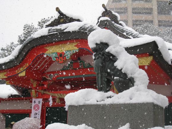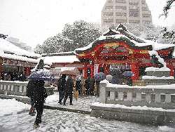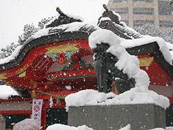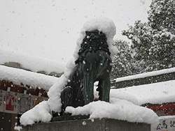| Friday, 1 January 2010: It's been snowing since yesterday, and we have a white New Year's Day. We walk through the local Kogane Shrine in the morning. | |
