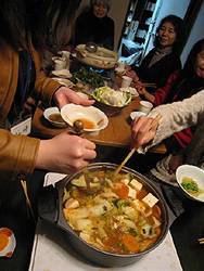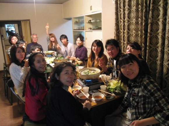 | Saturday, 26 December: Nabe party at our house, with local UNESCO's (mostly) young members. All three nabe with cod, small clams, tofu & veg, eaten with yuzu ponzu; the middle one is additionally flavoured with kimchi & miso. |