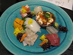 Later on... Dinner at Nomura, starting with this sashimi platter. The white stuff in ponzu sauce is fugu milt. |