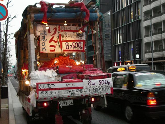 Kyoto, 8 April: Right in the middle of town, I encountered a big truck filled with organic apples from Aomori. The guy in red is our Apple Man. |