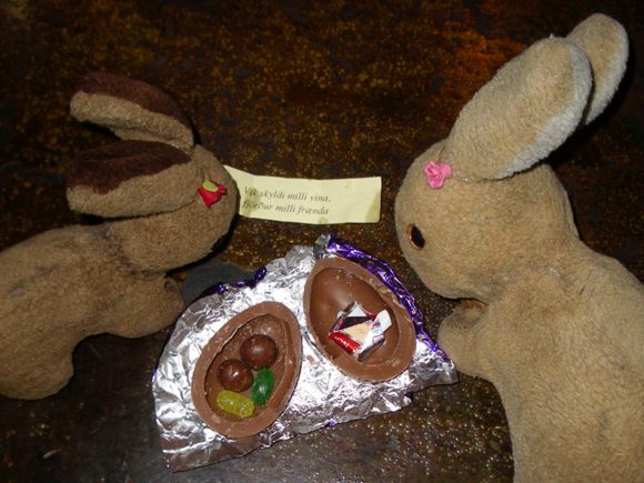 Íris gave us an Icelandic Easter egg. Inside was the proverb: Vík skyldi milli vina, fjöður milli fraenda (Something like the Japanese proverb: "rather the friends close-by than the family hundreds of miles away"?? I might be completely wrong - blame the booze!) |