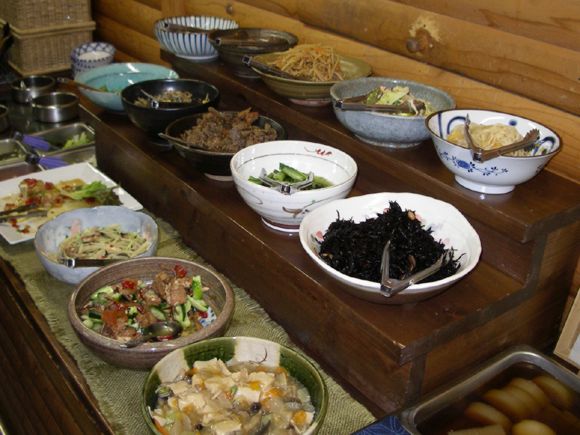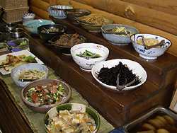 17 tasty cold dishes, plus salad, rice, miso soup, pickles, etc. |