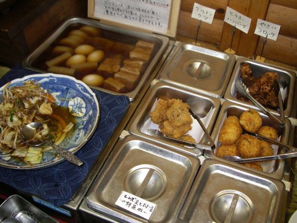 The hot food section: delicious tofu burgers, croquettes, bean curry, soup, oden. |
