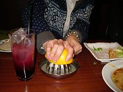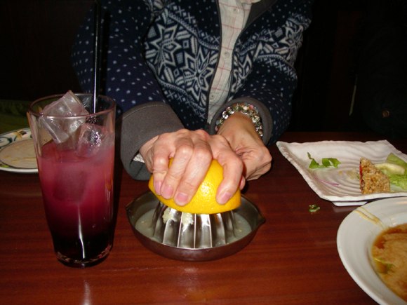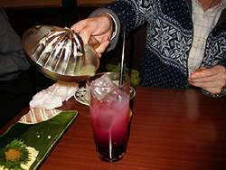 Noriko ordered a cocktail (shochu-based?) with cassis and fresh grapefruit juice, which you squeeze yourself... |