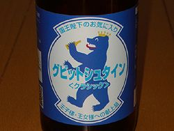 Also on the menu was a fizzy apple drink that comes in a beer bottle and looks like beer when poured too, called gubittostein - a great example of Japanese-German brand name ("gubitto" = swig, ie. kids can do the same as the grown-ups - like this royal bear's demonstrating.) |