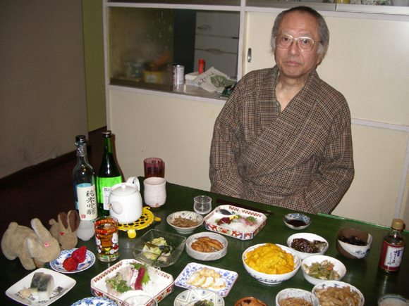 Gifu, 10 April: Last dinner at home. Hitomi gave UsaKousa strawberries "because it's your dad's birthday." (Some Girls always have it good!) Here the birthday boy is looking grumpy that he has to pose for the camera, rather than tuck straight into the sashimi... |
