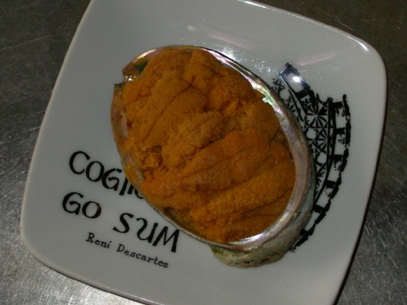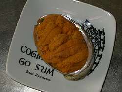 My friend Sachie sent me 2 uni specialities from North Japan a few days ago - unfortunately I was too excited to take any photo of the fresh uni (in a milk bottle filled with sea water) before consuming it. This one, in an abalone shell, was lightly pre-baked, so we heated it up for dinner. It looked like a little portion, but oh boy, it was about 1" deep, pure uni, so delicious, and sent me straight to heaven - on its own, with a dash of soy sauce, or with wasabi... mmmmmmmmmmmm. |