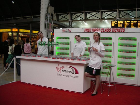 Later - Virgin Trains PR stand at Paddington Station, distributing these packages to promote their environemental friendliness. |