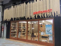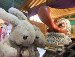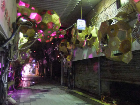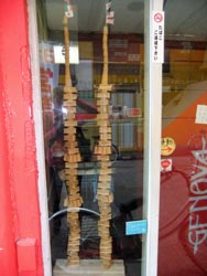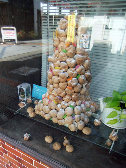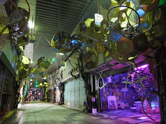 So instead, we walk along the arcades again, partly to look at the venues we missed previously, and to check out Tsuyoshi Ozawa's other pieces: mini Towers of Babel in various shops, made with products on sale. These are in conjunction with his Beppu Tower piece, and based on the regional tradition of creating statues out of all kinds of material. | |