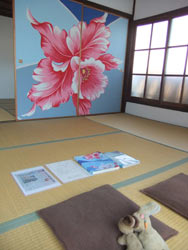 More art after lunch. Upstairs at the Beppu Project merchandise shop, we see Michael Lin's paintings on sliding doors, from the previous festival. Then we visit Kiyoshima Appartments, where young artists have been living and working, again since the last festival. |