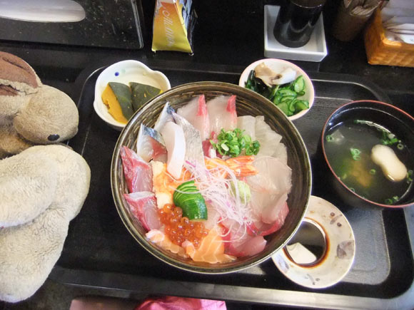 Walking back into town, we walk past the fish restaurant Izutsu, one of the many interesting sounding eateries mentioned in the festival guidebook. Since it's lunchtime, we pop in and order Seafood Don set lunch. For 980yen (10 Euro), it comes with a massive portion of fresh fish I can hardly finish (but manage in the end.) The mackerel is fresh (ie. not marinated), which you can never get elsewhere as mackerel goes bad quickly. But here in Ohita region, mackerel and horse mackerel, caught one by one with fishing rods, are local specialities