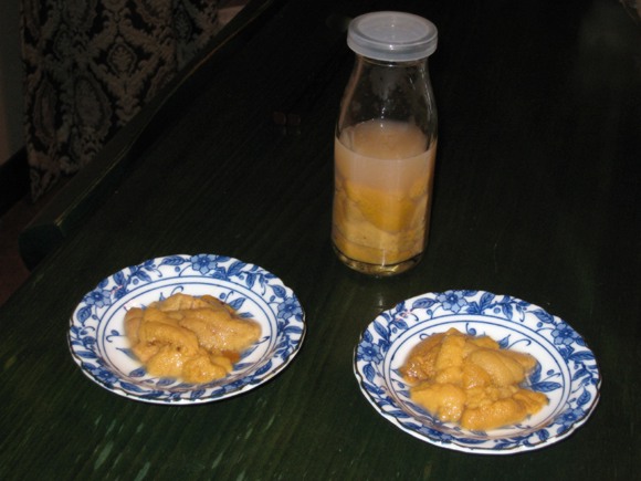 Thursday 24 April: A bottle of fresh uni (from Iwate in North Japan) in seawater arrives by courier - a gift from Sachie, in time for my birthday! |