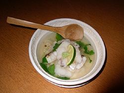 "Fluffy autumn steam", silken tofu, slices of fish (barracuda) and grated yam steamed & eaten with yuzu & wasabi. Mmm... |