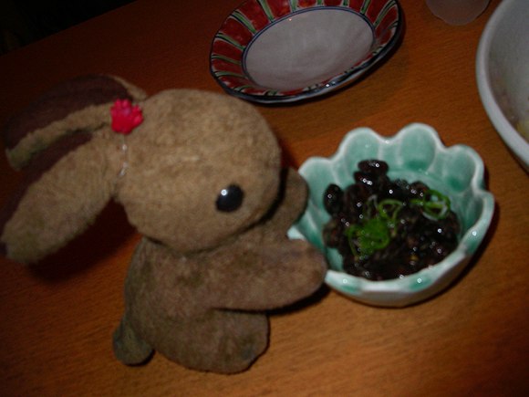 A very rare dish: natto made of big black soybeans, rather than the usual small ones. Less slime-to-beans ratio than the usual natto, but delicious! (Apologies for the out-of-focus photo.) |