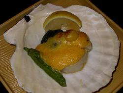 A little (thick) slice of scallop baked with a light, egg-based sauce, with a gingko nut on top. |