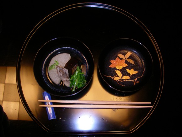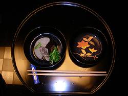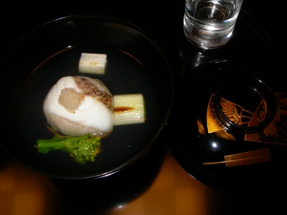 A selection of veg, cooked in a very fine broth again, served with herring wrapped in kombu and cooked in sweet sauce. |
