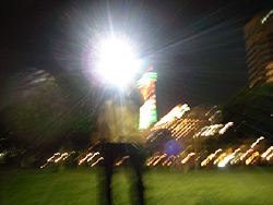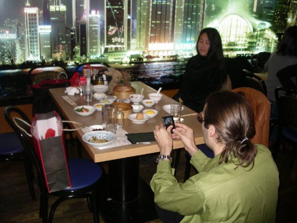Terre doing an artistic shot of UsaKousa, with Shanghai nightscape in the background. |