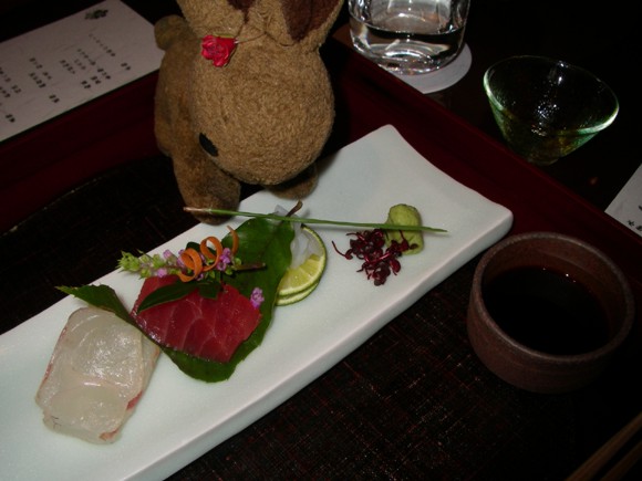 Kyoto-style dinner at Marriott, with aunts and cousin. Sea bream, tuna and (julienned) squid sashimi. |