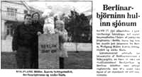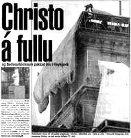Three artists from Berlin are planning to follow the footsteps of the Bulgarian landscape artist Cristo (sic) and wrap up the Berlin Bear on the corner of Sóleyjargata and Skothúsvegur on the 17th of June at 4AM. On the very same day, which also used to be the National Day of Germany before the Wall came down, Cristo (sic) are going to tackle his most ambitious work up to date, wrapping up the Parliament, the Reichstag, in bleak, synthetic material. The assignment of the three Berliners in Iceland, Wolfgang Muller (sic), Karola Schlegelmilch and Akiko Hada, will be on a slightly smaller scale, for while they are making do with six hands and an hour at most, Cristo (sic) will be assisted by sixty mountain climbers and he is going to spend almost 500 million Icelandic Kronur...