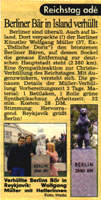 Reichstag adé Berlin Bear wrapped up in Iceland Berliners are everywhere. In Iceland, too. There the Berlin artist Wolfgang Müller (37, ex-"Tödliche Doris") wrapped up the bronze Berlin Bear, on the base of which the exact distance to the German capital is written (1,380km). An action in sympathy with Christo's wrapping of the Reichstag. With the tongue in cheek, of course. The exact details of Müller's wrapping action: Preparation time 2 days. Material: 1 bed sheet, 1 roll of synthetic string. Duration of execution: 32 min. Costs: 28DM. Atmosphere: wonderful. Reykjavík sends its regards to Berlin!