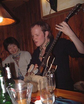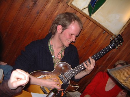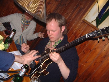 A couple of hours on, we decided we needed something to eat, so we took taxis to the Lucky's Pizzeria, where we not only had some food but also (of course) carried on drinking. Some time later on in the evening, Egill grabbed Vardi's guitar & the mini amplifier, and we got to hear an improvised concert! |