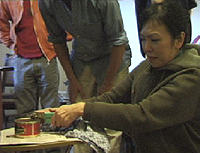I have to admit that I didn't get to read Jouni's instruction, that I should keep the can in the fridge, until several days later (nor did I read what it said on the can itself - "to be kept between 4-6C" - because the can itself stank of fish, and I immediately put it back into 4 or 5 layers of wrappings it had arrived in, and left it on my kitchen worktop.) So the fish must have fermented even further in the mean time. The can had expanded a little, we could all see... OK, it did smell very strongly as soon as Natsumi opened the can (while everyone else stayed as far away as possible), but it wasn't as bad as I had feared after reading all those warnings... In any case we didn't need to use the bucket filled with water, which was standing right next to the table in case. (One friend in Norway had told me "you have to open the stuff underwater!!") | ||