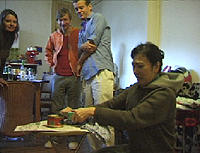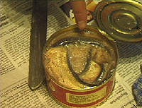 www.svensson.com/norge/sur1.htm Furthermore, we tried to invite a few Swedish friends along for the evening, just to make sure we did it "right". Max Andersson and his wife, Helena Ahonen, said they were busy at the weekend because of the Comic Festival (where Max was giving a lecture), but they confirmed the recipe over the phone and told me they were looking forward to seeing our report; Bettina tried to bring another Swedish artist, but she was busy, too, and could not make it. Whether these people were in fact relieved that they had other things to do on this evening, there is no way of knowing... ;-) So anyway, eight of us (plus one dog, one cat and two bunnies) got together at Natsumi & Helge's for the evening - although Couscous, the cat, immediately disappeared and hid in the bedroom throughout the ceremony (nothing to do with the fish, she was avoiding a confrontation with the dog, I think...) Having each read the printouts of the instructions, we proceeded to open the can... |