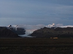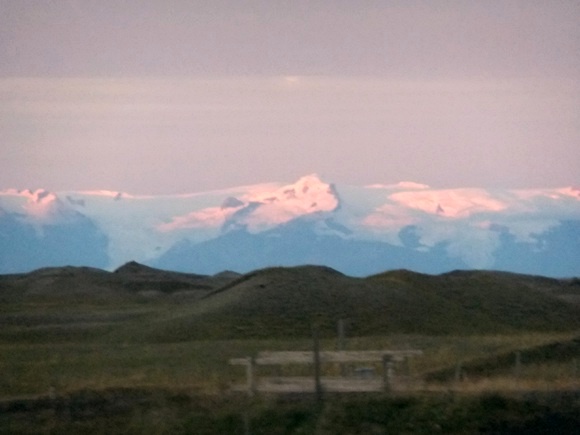 The sun is setting just as we drive towards Siðujökull, and the glacier is very pretty in pink. (A crappy photo taken from the car window.) |