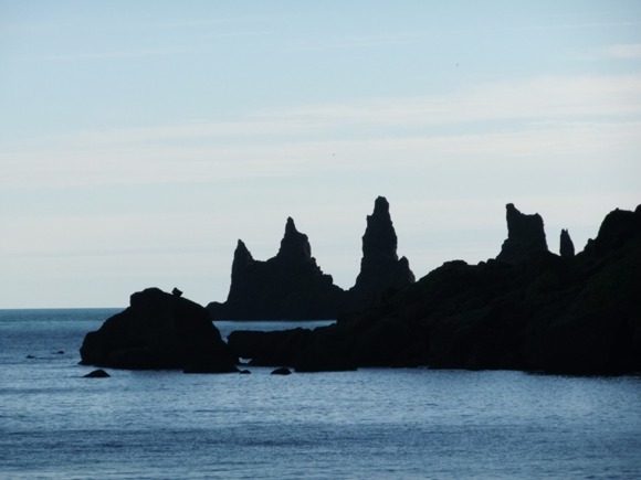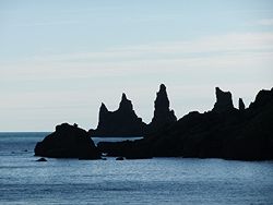 Rock columns sticking out of the sea, called Reynisdrangar. |