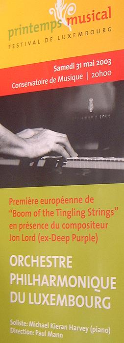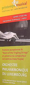 Poster for the concert we flew down to Luxembourg to see - the European premiere of Jon Lord's new piece, Boom of the Tingling Strings, performed by the Luxembourg Philharmonic Orchestra, conducted by Paul Mann, and the Australian pianist Michael Kieran Harvey. Also in the programme were Britten's