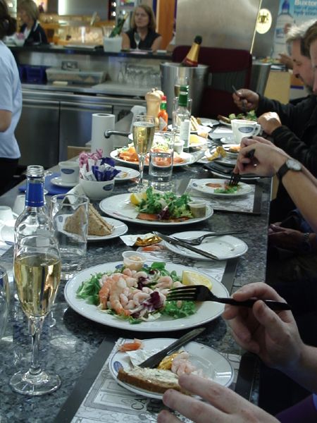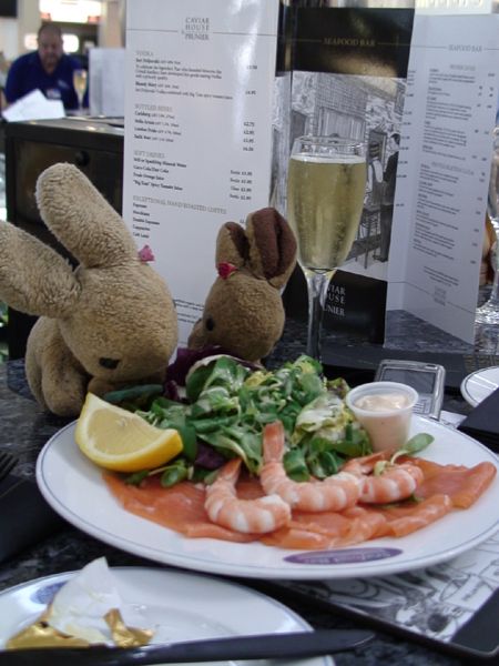 Click on the image to enlarge Friday, 8 September: As soon as we've checked in for our Atlantic Airways flight from London Stansted to Sumburgh and gone through the security control, we learn that our flight is delayed by over 5 hours, due to the fog in Shetlands. Since we are on a press trip, with all expenses paid for by the airline, we get to sit down for a champagne lunch at the Seafood Bar while waiting :-) | |