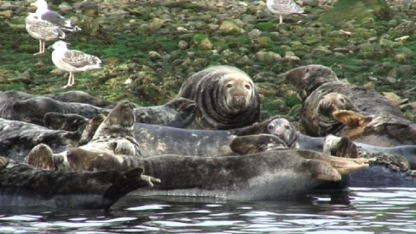 | Having picked up a few other passengers at the Lerwick harbour, the boat sails north between the mainland and Bressay. The first stop is the coastal area around a fish processing factory on the mainland, where many seals and seabirds hang out - for the fish waste, which is plentiful. | |