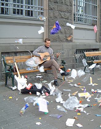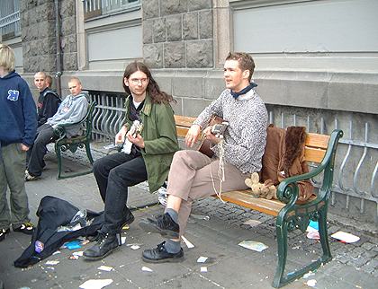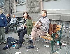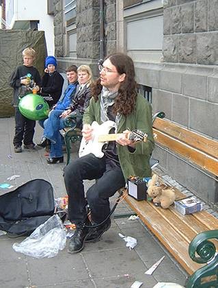 17 June: It's been sunny and *hot* all weekend, but today - the National Independence Day of Iceland, the sky is cloudy and the wind is cold and very strong. Nevertheless we go out into town to catch up with some of the festivities. Vardi (star of Vardi Goes Europe and featured in our report of the Icelandic events in Berlin in April) comes out with his guitar and goes busking with his friend Brynjar Larsen, so we follow them - UsaKousa sit on the bench with the two musicians and the miniature Marshall amp, getting squashed from time to time, but they love being rightthere at any musical performance...