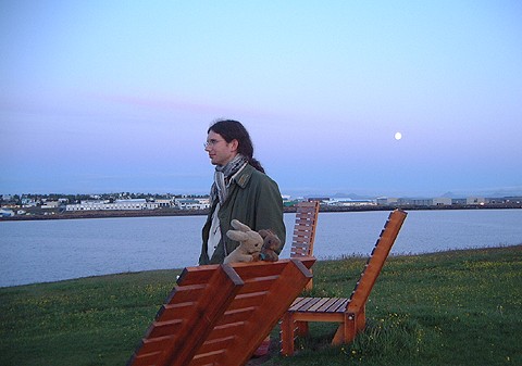 13 June: We arrive at Keflavík Airport just before midnight, surprised how warm it is (12 C). 14 June: We'd forgotten that the Chairman of P.R. of China (what's his name again?) was arriving more or less the same time as we were - there's a whole bunch of Falun Gong followers protesting (in the form of group meditation on the grass!) in town centre, and the bus we are on is diverted. A couple of months ago, our taxi to airport in Berlin got stuck in a mini traffic jam due to a Falun Gong demonstration during the said Chairman's visit to Berlin. We suspect he's a secret UsaKousa fan and is following us around... | |