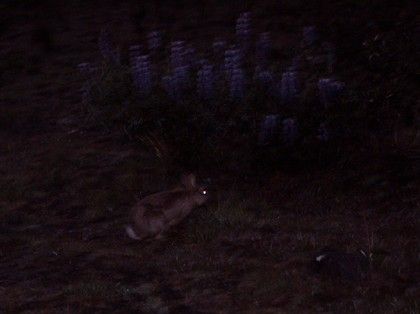 [** Well, the temperature of the sea water here is too low to swim in, so bathing on the beach was impossible/unheard of - until they made this artificial sand beach, with a small pool of heated seawater and deckchairs scattered around it, a few of which you see here in this photo on the right. A nice, cosy beach, we can imagine people sunbathing here on hot, sunny days, but there was no one around except some kids running around, fully clothed, when we were there. No wonder - if you look at how much clothes Vardi's got on, you can have an idea of the weather on this evening!] We walked back through the Öskjuhlíd hill where, apparently, many wild rabbits live. (Rabbits are not indigenous to Iceland, it's just that some pet rabbits have escaped and quickly built a big community in this area of town in the recent years!) And yes, we spotted this one at the bottom of the hill - munching away, even when we got fairly close to it to take the photo. (And no, it wasn't as black as that in real life, nor was it that dark. Just blame our crappy Fuji digital camera!) |
