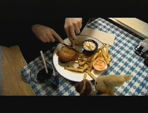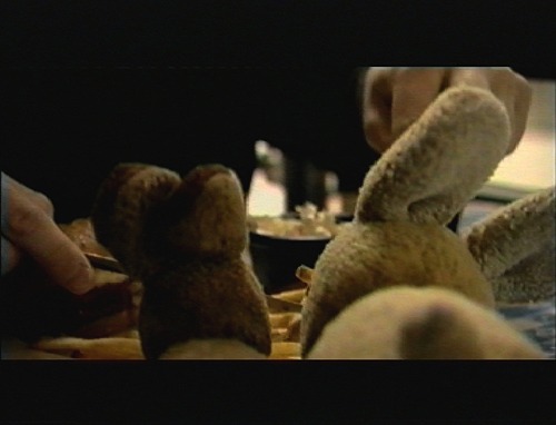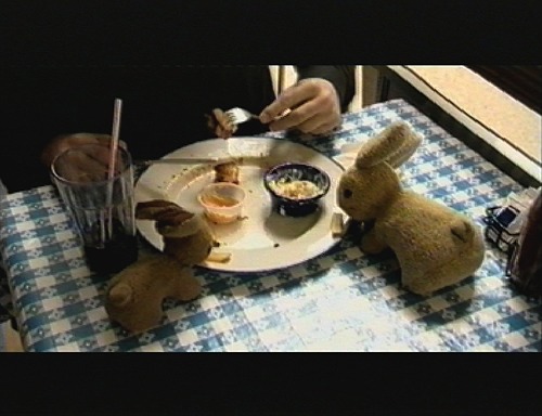 The hamburger arrives, and Bibbi puts two small fries on the edge of the plate, for Usako & Kousa.