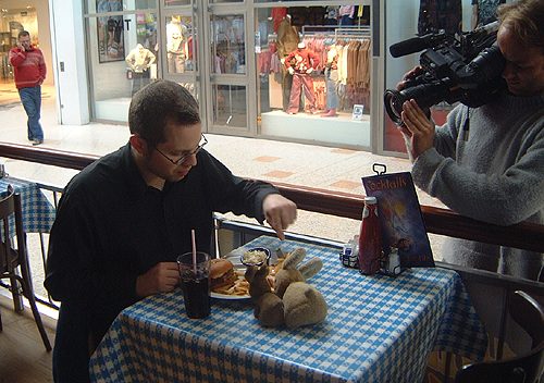On Sunday, Bibbi has commenced his 7-day long Hamburger Tour - he's eating 2 hamburgers a day, at 12pm and 7pm, at different locations throughout the city, from fast food joints to more upmarket restaurants. (Good thing he had a healthy dinner at Alma & Egill's on Saturday ;-) The "tourdates" have been published in the newspapers in advance, so anyone can go and watch him. We decided to go and check him out at the Hard Rock Cafe, situated inside the Kringlann shopping mall.