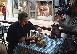 As it turns out, he had a radio reporter covering today's matinée; and now there are a TV crew and a newspaper photographer waiting to catch the evening performance. Bibbi invites Usako & Kousa to sit at (should that be on?) the table with him during the TV interview and during the actual show, so they shared a couple of fries on his plate. Hopefully we'll be getting hold of a video copy of the broadcast soon.