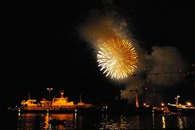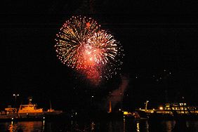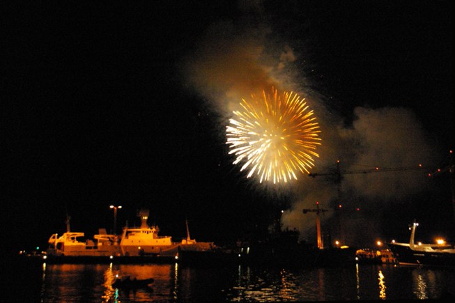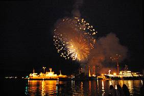 At 11PM, it's time for fireworks. This year we're right there at the harbour - a big mistake! After several shots the air gets very smoky and you can't take any good photos of the fireworks on their own. Oh well, it's nice and romantic out here. |