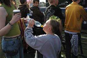 A young lad with a cool mohican hairdo, swigging mineral water. |