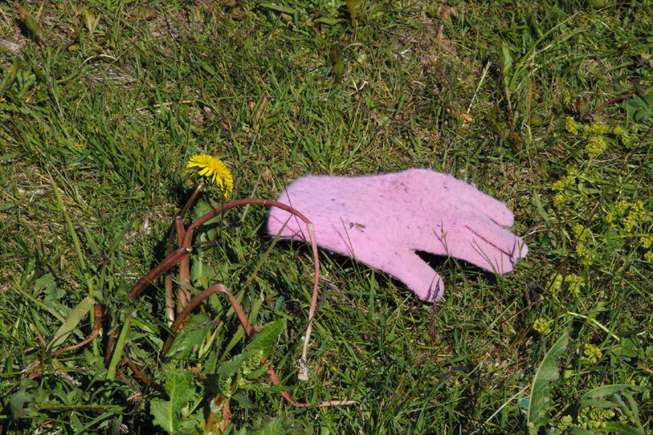 These are for Jez: a lost glove and a little flower keeping it company. |