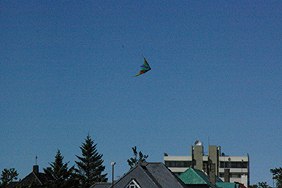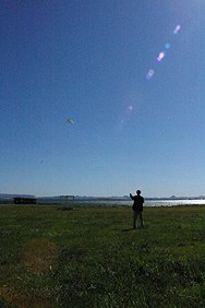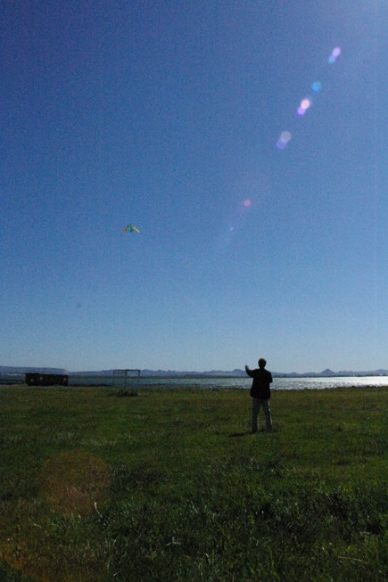 For a while I can't tell what this buzzing thing in the air is - then realise it's attached to a couple of strings, with a guy at the other end. Yes, it's the perfect weather for flying kites!